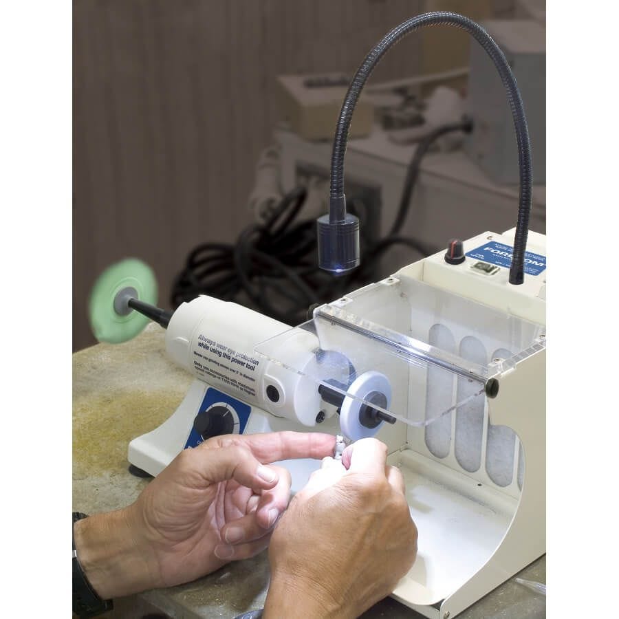 The M.BL Lathe and MAFH25 Filter Hood are designed to cleanliness in jewelry making. The M.BL Lathe, with its compact design, features a high torque, permanent magnet motor that runs quietly and smoothly, perfect for detailed work at the workbench. It is equipped with precision-machined spindles to hold various tools, offering a wide speed range for versatility. The MAFH25 Filter Hood, on the other hand, focuses on maintaining a clean working environment by efficiently collecting dust and particles from polishing. Its sturdy construction and design, including a clear shield and a bright LED light, make it an essential tool for any benchtop operation.